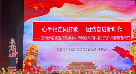 余艳娥老师结合自身对云南少数民族打歌民俗传统的研究,做了题为“心手相连同打歌 团结奋进新时代”的演讲,分享了少数民族打歌铸牢中华民族共同体意识的作用和机理研究方面的学术成果,受到了专家评委的高度赞扬。