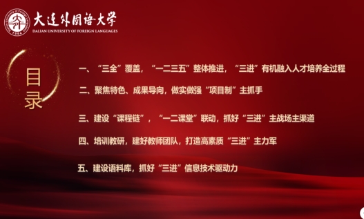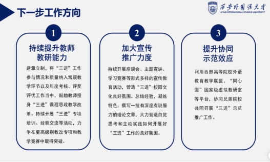 积极落实《习近平谈治国理政》‘三进’工作,2022-2023学年开设了和计划开设《理解当代中国汉英翻译》、《理解当代中国英语演讲》、《理解当代中国高级英语读写》3门本科课程,《理解当代中国高级汉英笔译》和《理解当代中国高级汉英口译》2门研究生课程。每门课程团队由3-5名任课教师构成,聘请了马克思主义学院专家做课程顾问,并定期进行教研指导。同时积极将《习近平谈治国理政》融入大学生公共英语和研究生公共英语教学,计划针对全校研究生开设英语类拓展课程《理解当代中国英语演讲》。