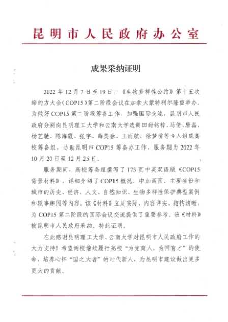服务期间,参与撰写了173页中英双语版《COP15背景材料》,详细介绍了COP15概况、中加两国、主要省份和城市的历史、经济、人文、自然知识、生物多样性保护典型案例和轶事趣闻等内容。该《材料》立足实际、内容详实、结构清晰,为COP15第二阶段的国际会议交流提供了重要参考,被昆明市人民政府采纳。