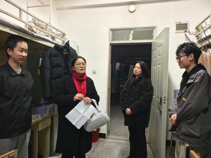 院长王英、党委副书记孙冠华、研究生辅导员马超然深入研究生宿舍走访慰问,与同学们面对面交流,细致了解大家学习科研、日常生活等情况。
