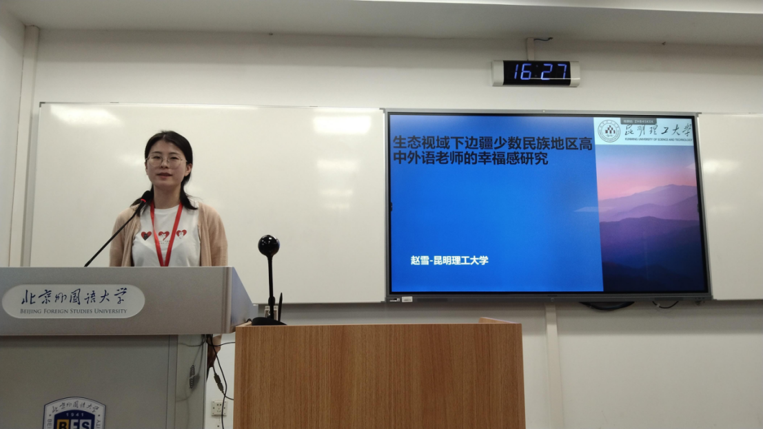 赵雪作为青年教师以《生态视域下边疆少数民族地区外语教师幸福感研究》为题,在外语教师发展研究第十六分组进行学术报告。乡村教师是发展更加公平更有质量乡村教育的基础支撑,是推进乡村振兴、建设社会主义现代化强国、实现中华民族伟大复兴的重要力量。关注边疆地区基础教育外语教师幸福感,促进乡村教育内生动力,进而惠及学生。