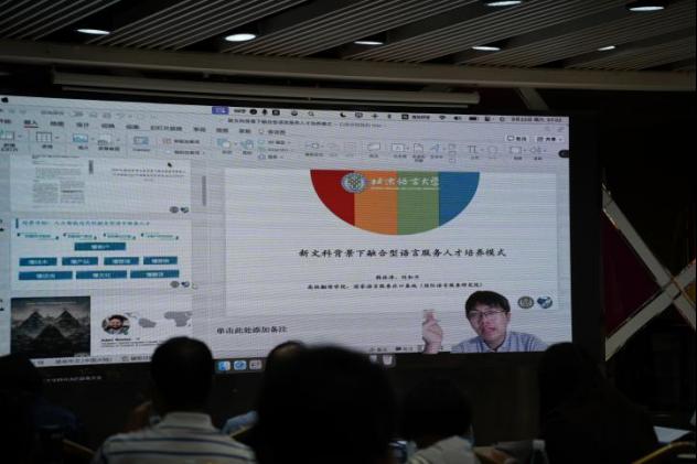 北京语言大学外国语学部高级翻译21点规则韩林涛博士在英国线上参会。他的发言以《新文科背景下融合型语言服务人才培养模式》为题,探讨了在新文科背景下融合型语言服务人才培养模式、路径和体系。语言服务与传统的外语和翻译既有传承,也有创新。其独特之处体现在“融合”上。报告围绕如何根据市场需求设计培养方案,如何解决外语学科与专业的有机融合,如何通过政产学研一体化融合驱动语言服务课程体系升级,先前的探索如何在新文科背景下形成体系和模式等问题进行思考。