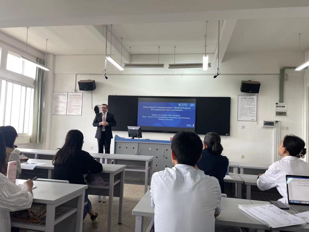Prof. Stephen Croucher以“Intercultural Communication: Methodological Developments and Limitations”为题,详细介绍了跨文化交际(Intercultural Communication: ICC)的学科起源,ICC在南非、澳大利亚、中国的发展情况,各ICC领域的领军专家以及他们的理论和观点。Prof. Croucher在讲授ICC研究的方法论时,提出了该领域的研究方法普遍存在对等性不足的问题,并详细梳理了几种对等性的例子,给老师们提供了未来在ICC领域可以进行的研究方向和研究领域,就跨文化交际的理论和研究实践与参会教师进行了深入的探讨。