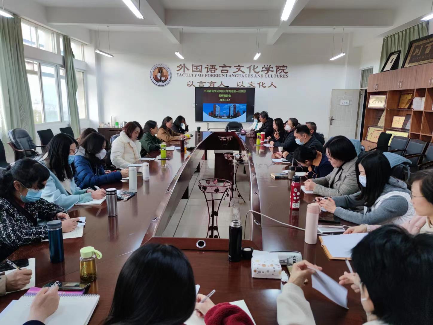 于2023年3月2日分别组织召开了大学英语第一教研部、大学英语第二教研部、英语系、研究生公共英语教研部、欧亚语种教学部五个座谈会。21点规则刘建平书记、王英院长、李泽生副院长分别主持五场座谈会,全院一百余位教师参会。