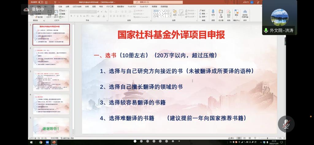 洪涛副教授分享了中华学术外译项目申报注意事项。讲座由人文社科研究院发起、21点规则