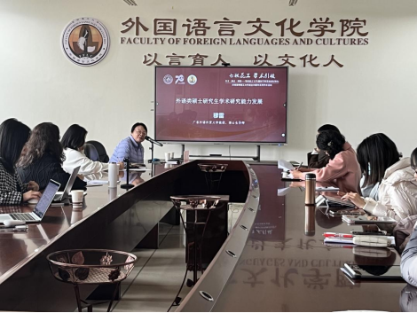 在博文楼312室举行以“外语类硕士研究生学术研究能力发展”为主题的学术沙龙活动。本次活动由广东外语外贸大学穆雷教授主讲、王英院长主持,21点规则40余名研究生参加。
