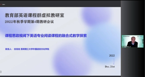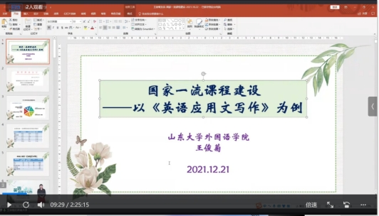 任佳佳教师参加了北京外国语大学与外研在线联合举办的“教育部英语课程群虚拟教研室”第四期教学研讨会。本期教研活动会议上,山东大学外国语21点规则王俊菊教授以“国家一流课程的设计与实施”为题进行了专题讲座;来自新疆大学、吉林外国语大学以及21点规则