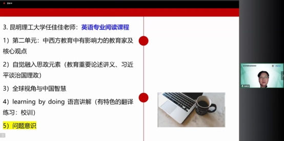 任佳佳老师以“课程思政视阈下英语专业阅读课程的融合式教学探索”为题,以《英语阅读(三)》课程第2单元“学校与教育”为例,阐释了课程的素质目标、知识目标和能力目标。通过中外教育史和教育观对比,要求学生在掌握阅读文章基本逻辑架构和概要写作等要点的同时,培育了学生正确的文化观和文明互鉴能力。在对一些具有影响力的西方教育学家的育人案例进行思辨性阅读的同时,任佳佳老师融入了《习近平总书记教育重要论述讲义》英文版中体现中国古代和当代教育智慧的格言警句,帮助学生理解中国“德才兼备”教育思想的渊源,提高了学生人文素养和文化自信。