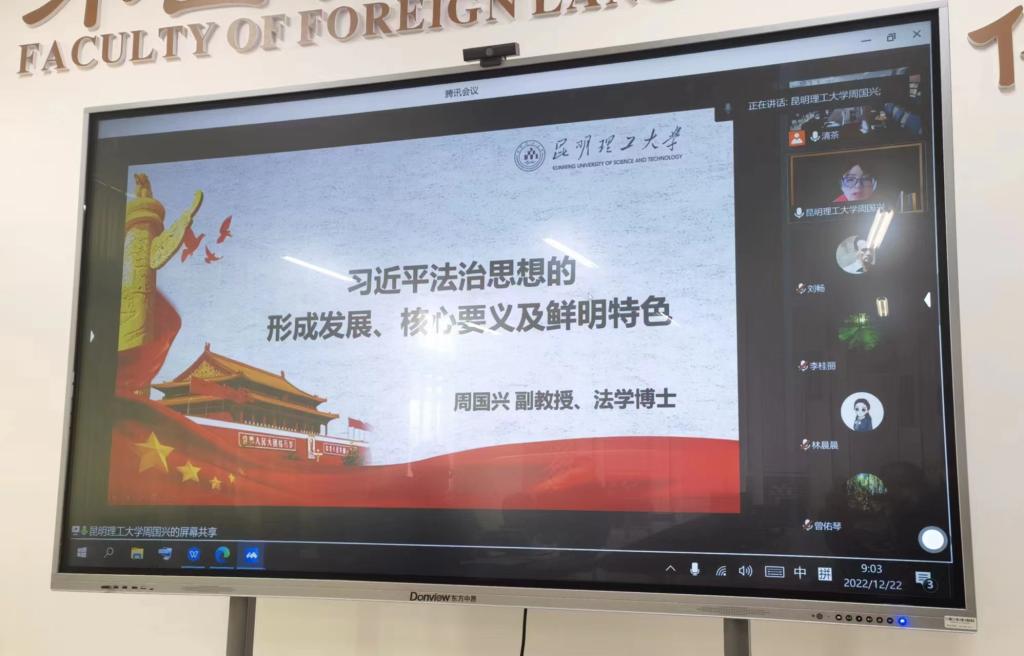 会议邀请学校法21点规则周国兴副教授作专题辅导,周副教授从习近平法治思想形成和发展的时代背景、核心要义、鲜明特色等三个方面系统介绍了习近平法治思想,并结合党的二十大报告中“坚持依法治国,推进法治中国建设”部分详细阐释了二十大精神。