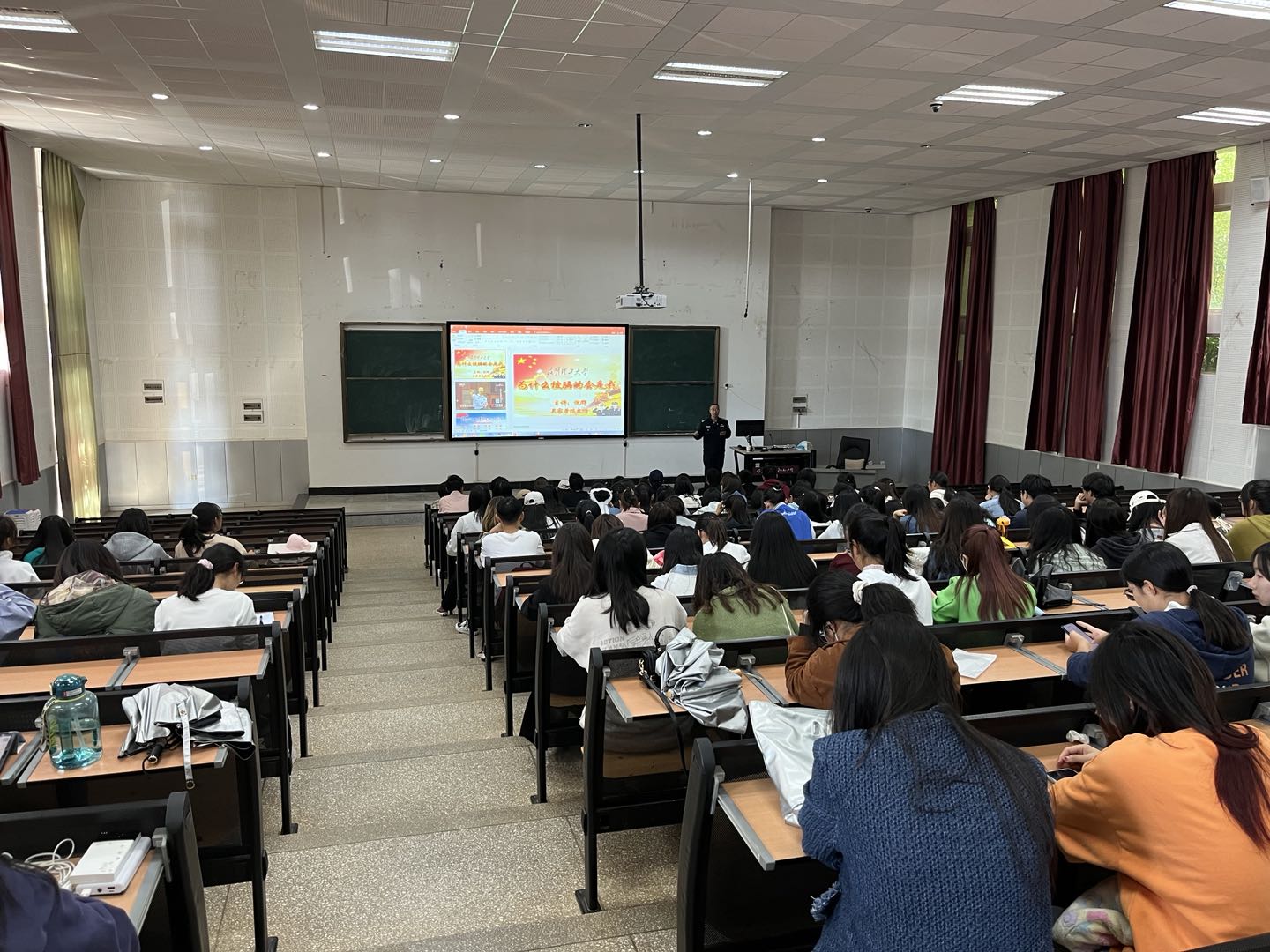 倪辉警官以“为什么被骗的会是我”为主题,为同学们深刻分析了网贷、冒充、中奖、网购、兼职、补贴、借钱等七种常见的诈骗手段,强调了操场、食堂、图书馆等七个诈骗高发地点。以“十个提醒一份爱”提醒各位同学防范冲突斗殴、邪教、毒品、传销、网络言论、晚归、会见网友、违规用电用火、恐怖活动和违规出行等方面的危害。以自己根据真实案例编成的顺口溜提醒广大同学在生活中一定要谨防诈骗以及其他方面的危险。