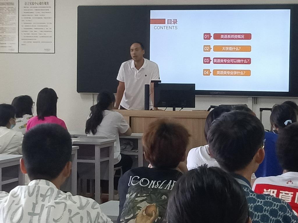 的教师队伍,分享了各位老师的新生寄语。黄娟老师以大学之道开题,针对新生如何做好自我定位、如何调整心态迎接学习任务等问题做出了详细的解答。高维老师以自身的学习经历为例,鼓励学生充分发挥自身的语言优势,挖掘潜能、突破自我。