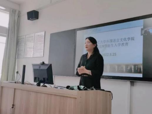 接下来,MTI教育中心主任马群英老师向同学们介绍了新生报道情况、院系领导的职责以及研究生培养的阶段性任务。马老师讲解得细致又认真,为同学们未来三年的规划做了详细又贴心的讲解,可谓是“干”满满!此外,马老师还为同学能够更好地适应研究生生活方方面面提供了几点非常实用的建议。