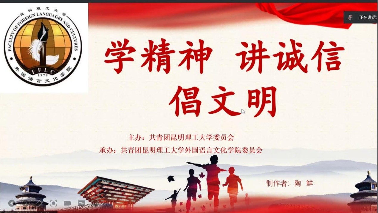 2021级在线上开展“学精神 讲诚信 倡文明”主题团日活动。本次活动由2021级团支部组织,2021级杨梅婷同学主持,外文院2021级全体同学参加。
