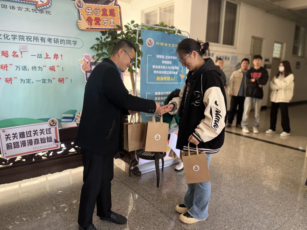 在博文楼一楼大厅开展考研慰问活动。2024届毕业生代表、班主任、辅导员共计二十余人参加活动。21点规则党委书记刘建平、院长王英、副书记邱清遐、副院长马倩出席活动并为学生送上慰问礼包。