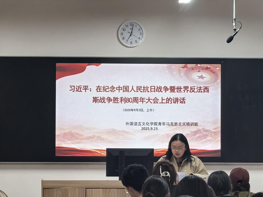 在博文楼403教室举办学院青马班培训讲座,集中学习习近平总书记在纪念中国人民抗日战争暨世界反法西斯战争胜利80周年大会上的重要讲话精神。此次讲座由学院团委书记李雪瑜老师主讲,外文院全体团学干部参加。