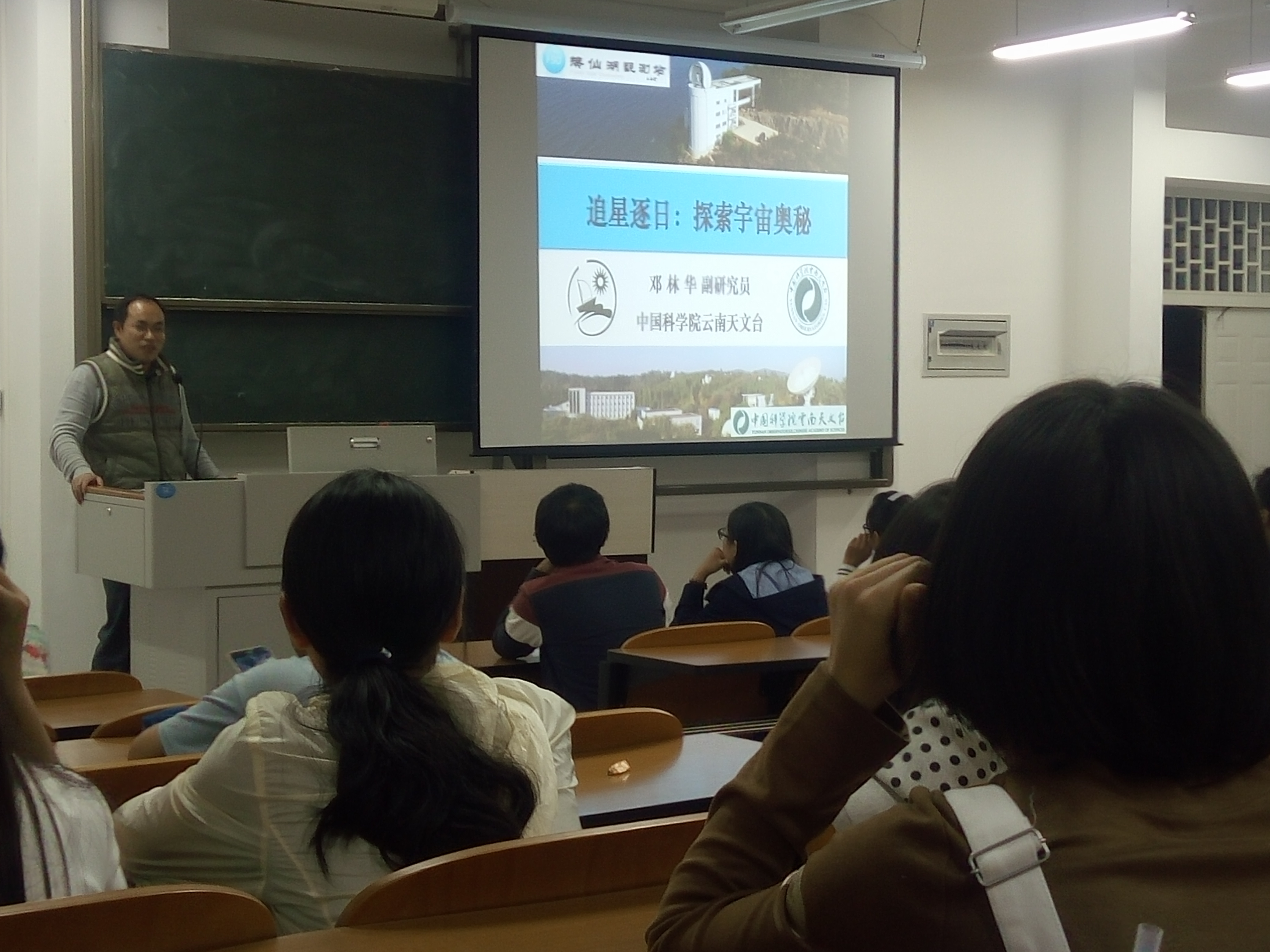 当晚19点整,明亮的灯光,攒动的人头,讲座正式开始。在主持人李银梅对本次讲座做了一番简单的讲解并介绍主讲人邓林华后,邓副研究员就太阳物理展开了一场精彩的讲座。璀璨星空和熠熠星光,一张瑰丽的星空图拉开了序幕,140亿年前的宇宙大爆炸,神奇的物理性冷却、凝聚,为我们带来了未知迷人的宇宙。邓副研究员用他幽默风趣的语言营造了一个愉快的氛围,又从引力波开始,一步一步我们展示了头顶这片星空的迷人之处。引力波的提出到发现推翻了“宇宙并非永恒存在,而是从虚无创生”的古典西方文化思想。随后,在邓副研究员的解说下,穿梭星云,展示了我们生活中耳熟能详的太阳系,又是一番新的体验。同学们在这个单元,看到了熟悉的八大行星,却收获了新的知识。百年难遇的哈雷彗星、美丽的流星、神奇的太阳等多个内容,开阔了同学们的眼界,丰富了同学们的知识,激起了同学们探索宇宙的激情。最后,邓副研究员向同学们展示了云南天文台的各项设备和全国各地的天文台,精密严谨的设备引起同学们的惊叹,让同学们对天文方面有了新的认知。就在大家意犹未尽的时候,主持人宣布讲座结束,长达一个小时的讲座在同学们热烈的掌声中落下帷幕。