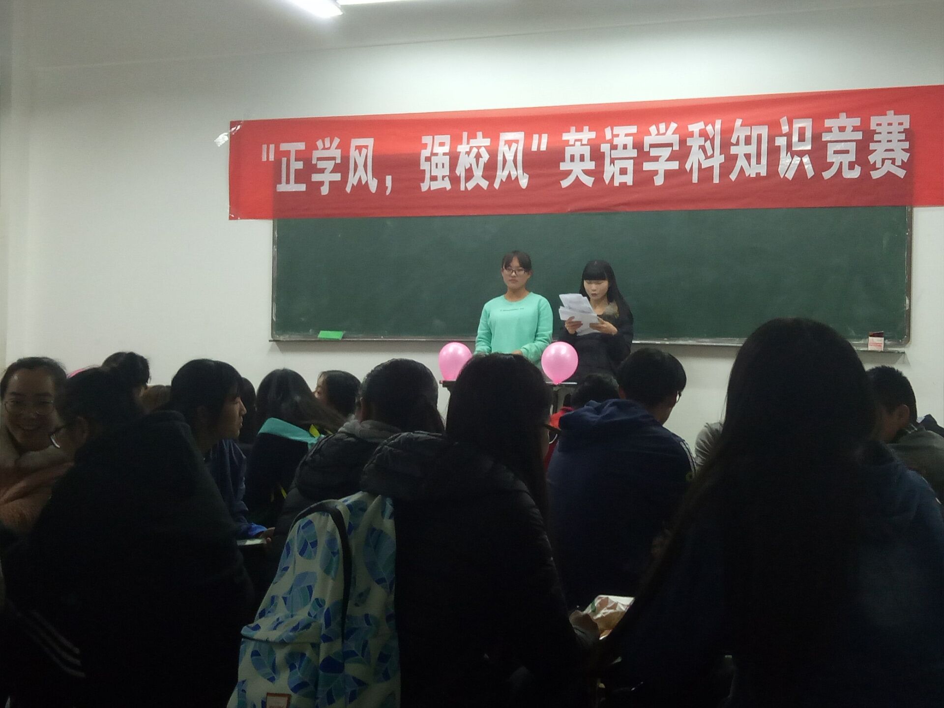 在博文楼212举办以“正学风,强校风”为主题的英语学科知识竞赛。本次知识竞赛由外文院16级同学黄蕾和潘霞主持,外文院16级同学积极参加比赛。