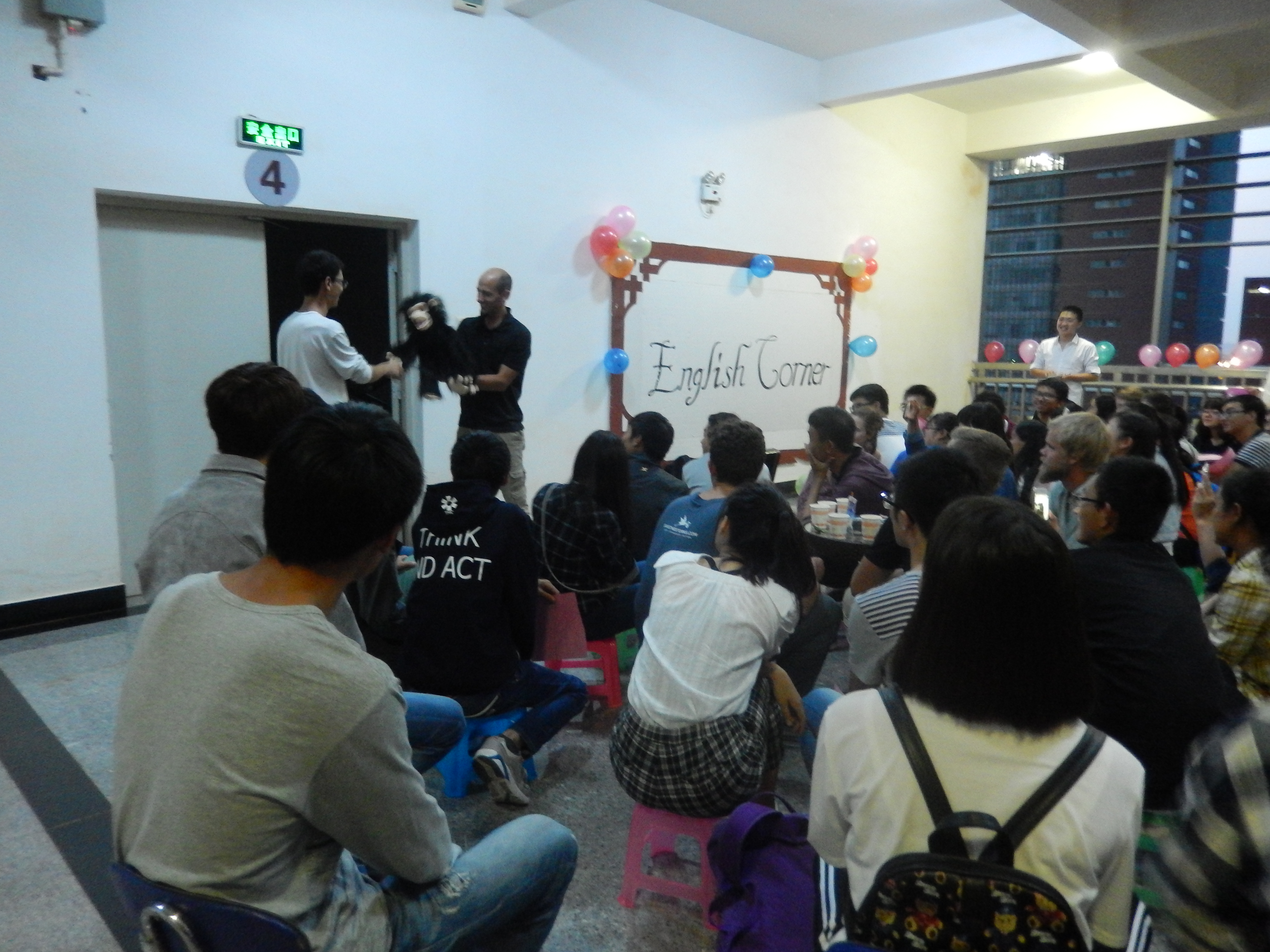 晚上7点整,活动正式开始。在主持人吴瑞丰简短的开场白之后,外国友人Byron首先为我们带来了精彩的腹语表演,同学们的笑声一阵接一阵,现场气氛迅速活跃起来。第二环节开展了“你画我猜”的游戏。一共八名志愿者,每两人分成一个小组,进行了两次PK,第一轮获胜的是崔海凤和李晴雯小组,第二轮获胜的是黄玺与外国友人Gerey小组。第三环节开展话题交流活动。现场为大家准备了一些话题,同学们根据这些话题与外国友人进行交流。同学们都非常积极,场面非常热闹,将现场气氛推到高潮。整场活动持续了一个半小时,整个过程中,大家都沉浸在欢快和谐的气氛里。最后,主持人对本次活动做了总结,本次英语角活动圆满结束。