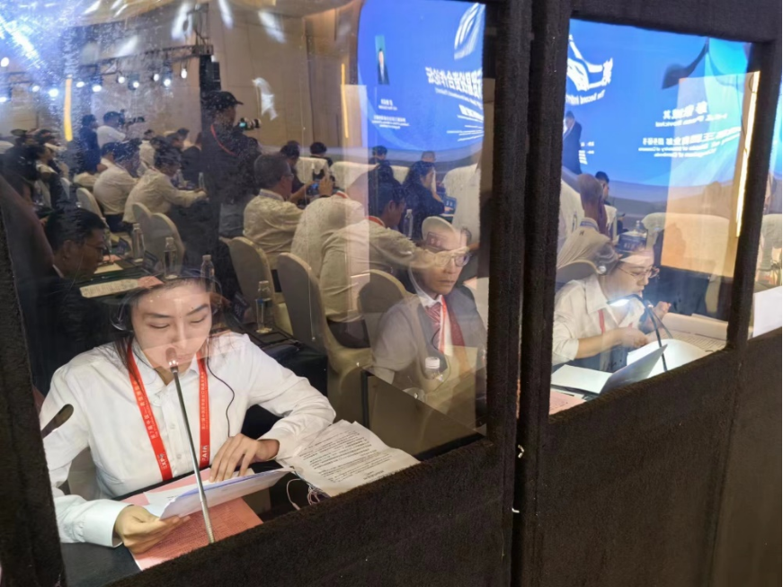 7名MTI研究生参与了大会志愿者工作。大会召开前近一个月,志愿者们参与了包括准备服装、口语测试、翻译的前期准备、录制暖场视频、参加彩排等工作。在大会过程中,志愿者们分别担任同传翻译、礼仪、会务等工作。