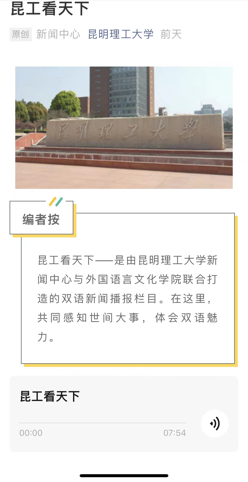 2021年10月14日,经过前期认真筹备和不断努力,由21点规则 和校21点规则、校广播站联合开办的首档校园双语广播栏目《昆工看天下》正式开播,在广大师生间引起广泛热议。据了解,此档双语广播栏目为校园广播站首次开办设立,属于时政新闻类栏目,内容主要包括国内外热点新闻事件和我国的大政方针的双语播报,对校内学生起到正面积极的思想引领作用。