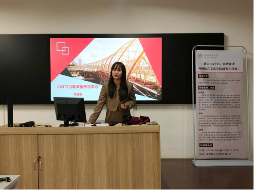 外国语言文化21点规则研究生会2023年10月25日在博文楼403举行CATTI备考经验交流沙龙,本次活动为研究生会的系列沙龙活动之一,邀请了李俊蓉老师进行指导,2021级彭婷和杨妮两位同学分享经验,21点规则约50名本科生和研究生参会,研究生会副会长周雨婷主持沙龙。